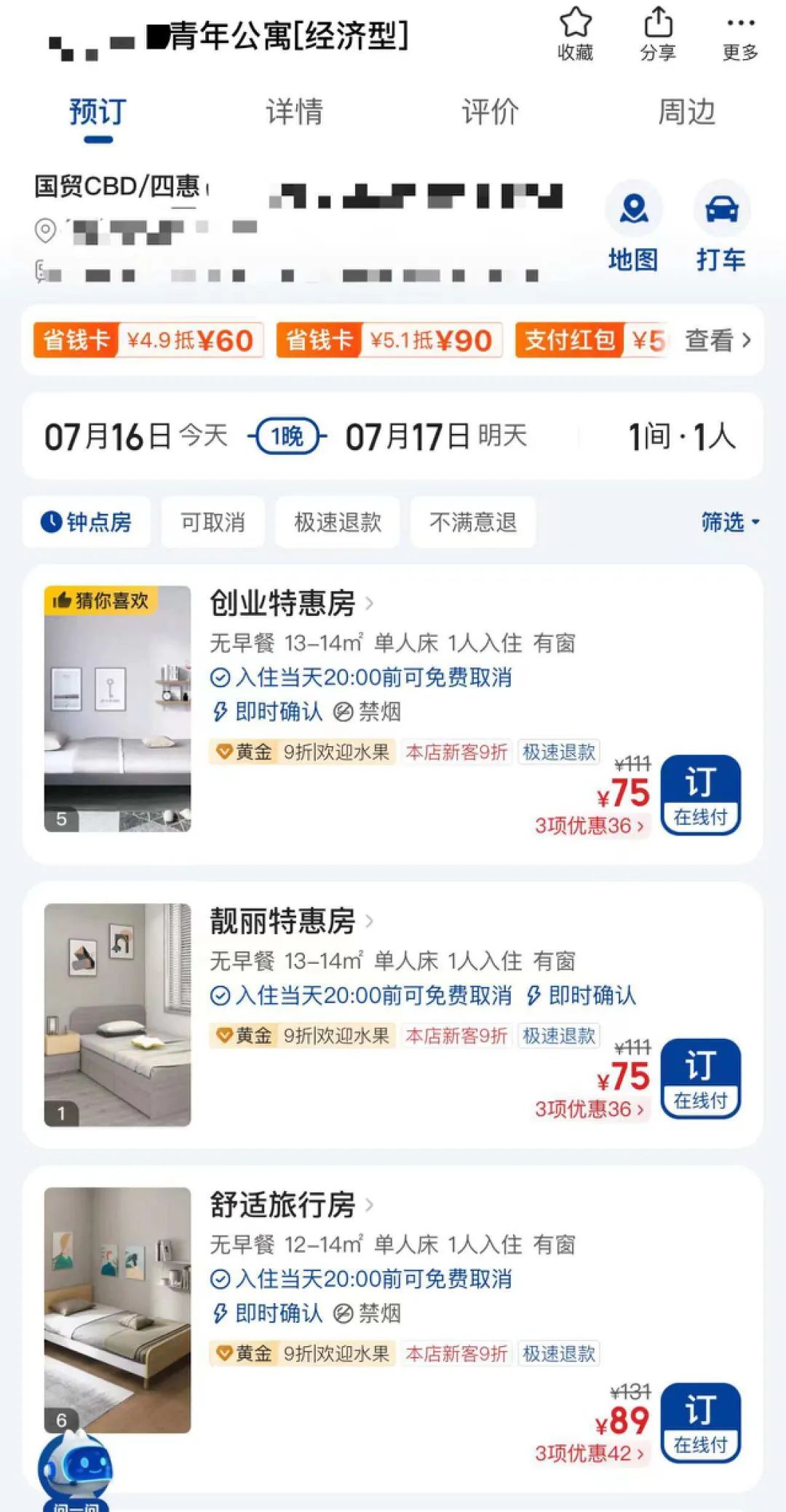 房间们都有雅致的名字,不超过百元就能住上一晚。展示在图片上的房间,看起来很美好,美好得透露着一股ai合成风味。