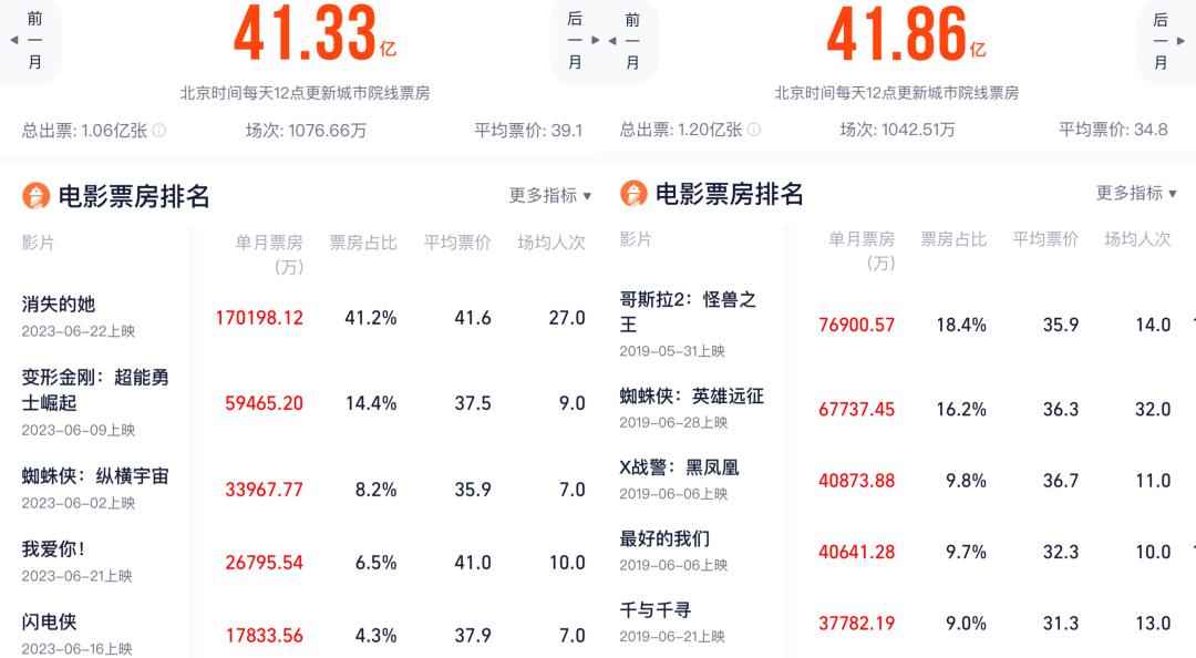 结果是,六月大盘报收41.33亿,几乎去最高点的2019年6月持平,而《消失的她》在其中一骑绝尘,占比超过41%。好莱坞大片虽然来势汹汹,但加起来也抢不过国产片的风头,这种局面与2019年六月是截然不同的:当时月度排名三的影片是《哥斯拉2:怪兽之王》(7.69亿)《蜘蛛侠:英雄远征》(6.77亿)和《X战警:黑凤凰》。