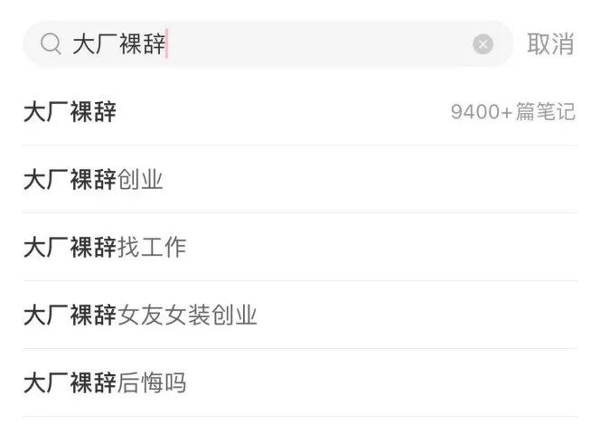 小红书上搜索“大厂裸辞”,可以看到9400+篇笔记,同时“大厂裸辞创业”的词条自动紧随其后。