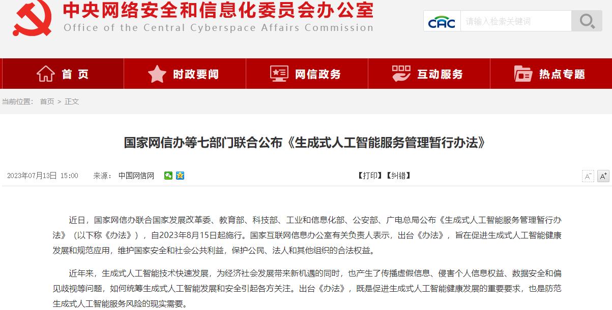 7月13日,国家网信办联合国家发展和改革委员会、教育部、科学技术部、工业和信息化部、公安部、国家广播电视总局公布了《生成式人工智能服务管理暂行办法》,对生成式人工智能技术的发展与治理、服务规范、监督检查和法律责任做出明确规定,自2023年8月15日起施行。