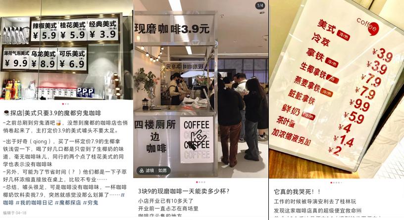 小红书搜索3.9元咖啡,会发现,3.9元咖啡不是CoCo的专属,它甚至成为一种“常态”,从连锁品牌到独立门店,从县域市场到魔都、京城,都分布着售卖“3.9元经典美式”的咖啡门店。
