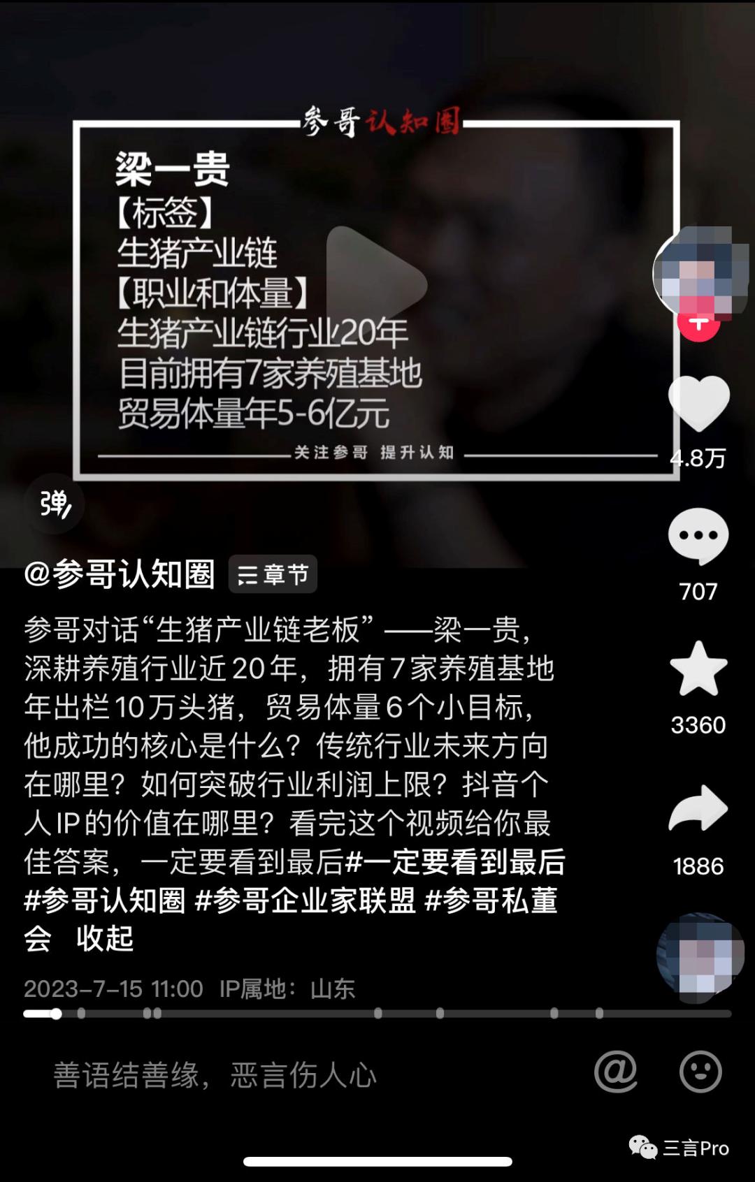 7月15日发布的一期视频中,参哥的访谈对象是某生猪产业链老板。据其介绍,该老板从事生猪产业链行业近20年,目前拥有7家养殖基地,贸易体量年5-6亿元。