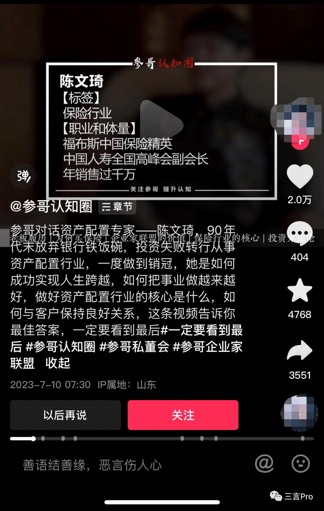 7月10日发布的一期视频中,参哥的访谈对象是一位资产配置专家,也就是做的保险行业。据其介绍,这位专家的家庭是一个金融世家,自己于90年代末从银行离职创业,后来因为乱投资,资金链断裂,之后转行从事保险行业,现在一年的销售额有大几千万。