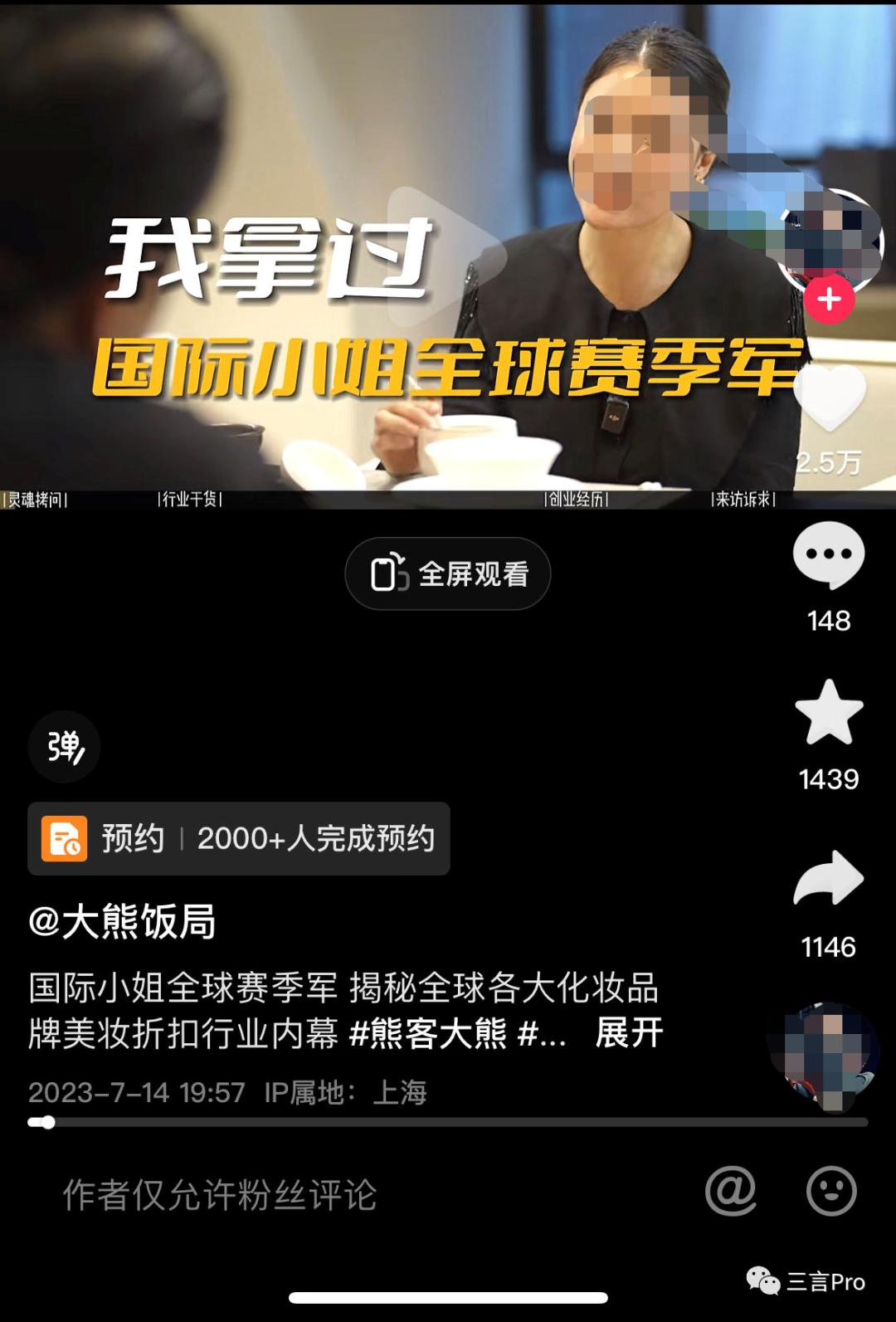 大熊饭局7月14日发布的一期视频中,访谈对象是一位国际小姐全球冠军。据其介绍,这位冠军小姐的生意是全球美妆折扣平台,目前团队五十多人,GMV可以达到几千万,合伙人门店超过50家,预计今年能做到500家。