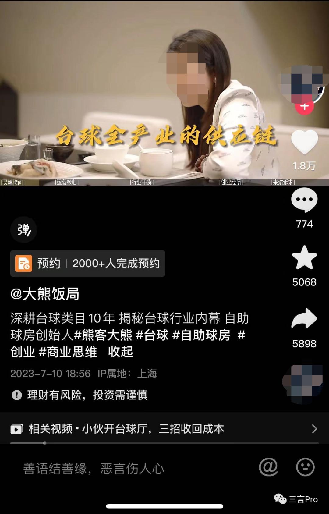 7月10日发布一期视频中,大熊的访谈对象是一位自主球房创始人。据其介绍,这位女士现在做的业务包括台球全产业的供应链、24小时自主球房、大型娱乐综合体。一年的收入可达上亿元,毛利30%。
