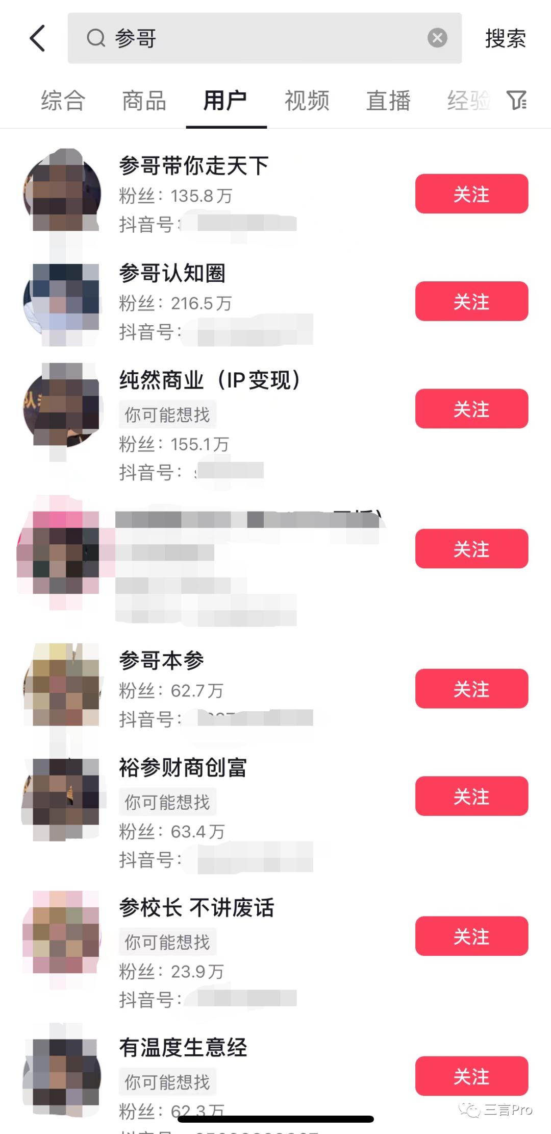 参哥自身的账号,也是玩的矩阵,在某短视频平台以“参哥”为关键字搜索用户,出来的结果一页屏幕装不下。