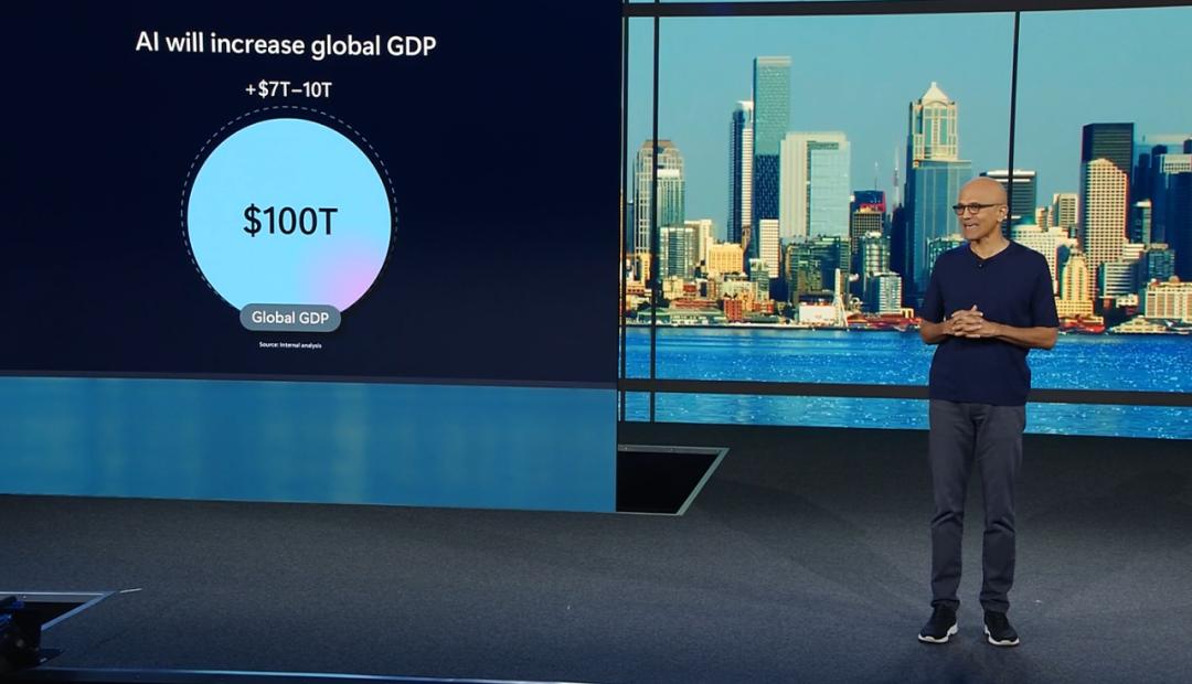至于 AI 进入人们的工作流,究竟能够带来多少提升?此前我们担心人类工作会被替代,随后又讨论了算力的紧缺,现在纳德拉给了一个比较具体的数字:未来 AI 技术将为全球增加 7-10% 的 GDP。