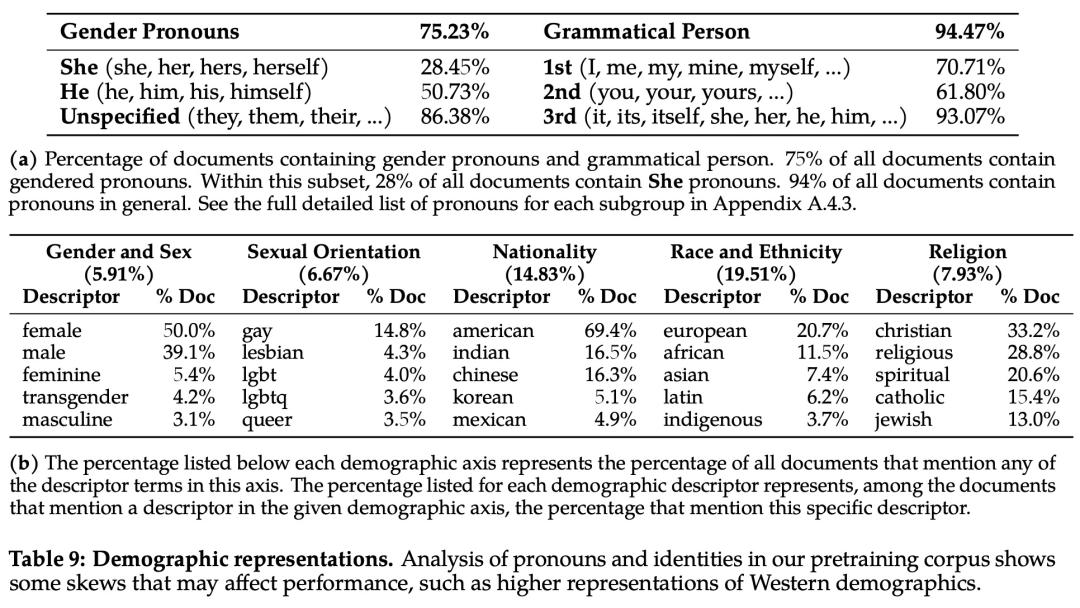 为了分析偏见方面的问题,该研究统计分析了预训练语料库中的代词和身份相关术语及其占比,如下表 9 所示:
