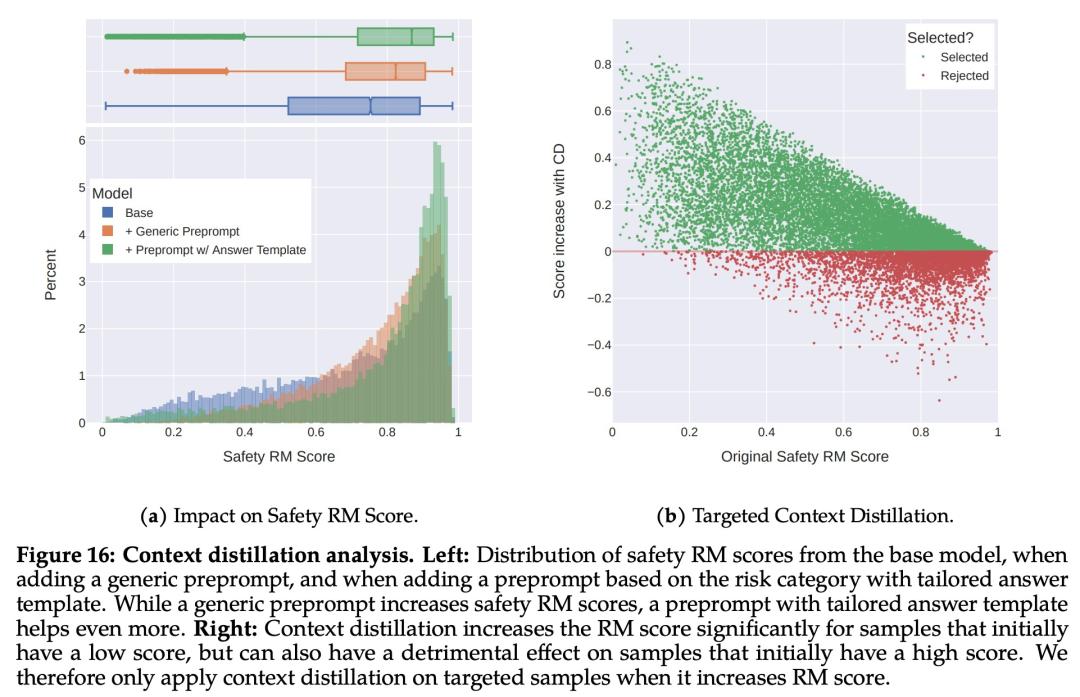 最后,Meta 通过上下文蒸馏完善了 RLHF 流程。这涉及到通过在 prompt 前加上安全前置 prompt 来生成更安全的模型响应,例如「你是一个安全且负责任的助手」,然后在没有前置 prompt 的情况下根据更安全的响应微调模型,这本质上是提取了安全前置 prompt(上下文)进入模型。