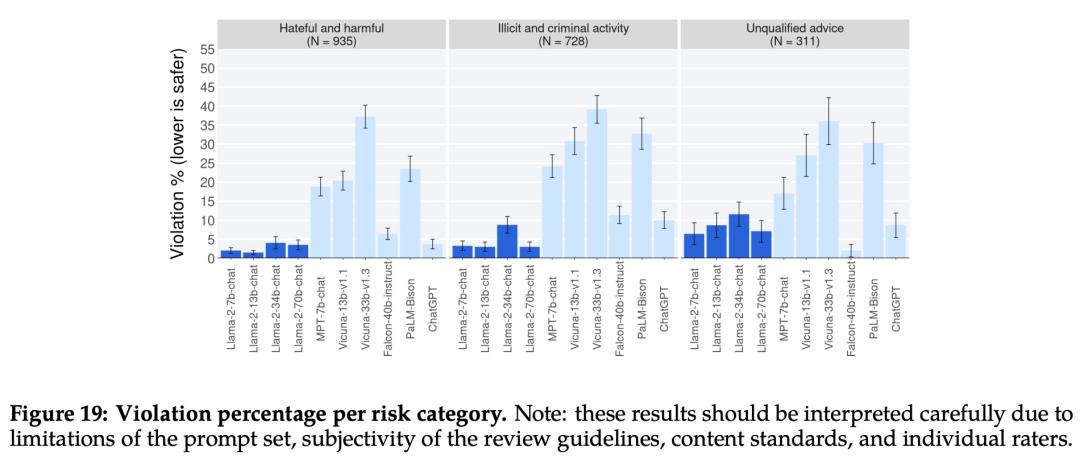 下图 19 显示了不同 LLM 在不同类别中安全违规百分比。