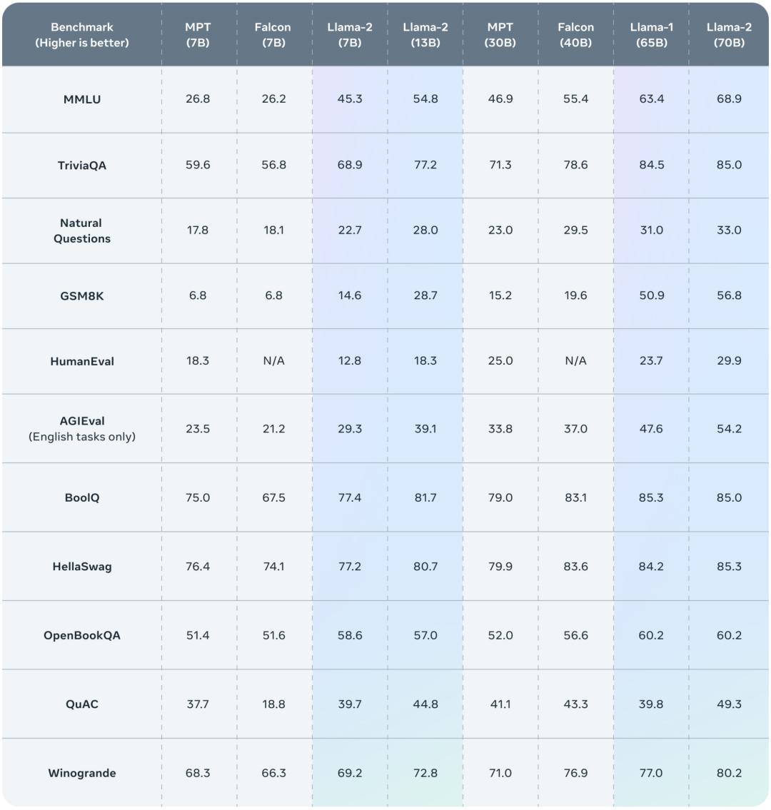 Meta 报告了 Llama 1、Llama 2 基础模型、MPT(MosaicML)和 Falcon 等开源模型在标准学术基准上的结果。