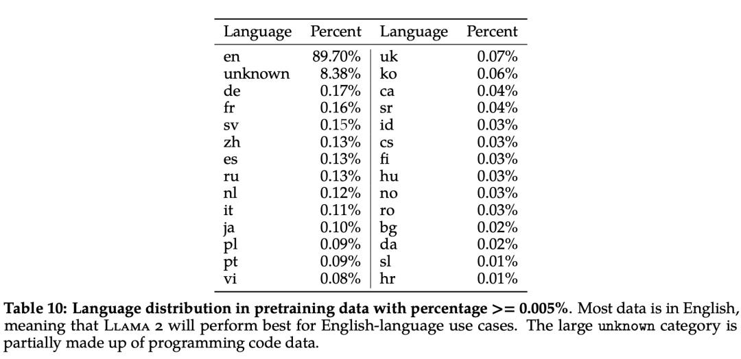 此外,在语言分布方面,Llama 2 语料库涵盖的语种及其占比如下表 10 所示: