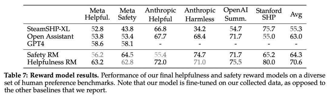 下表 7 中报告了准确率结果。不出所料,Meta 自己的奖励模型在基于 Llama 2-Chat 收集的内部测试集上表现最佳,其中「有用性」奖励模型在「元有用性」测试集上表现最佳,同样,「安全性」奖励模型在「元安全性」测试集上表现最佳。