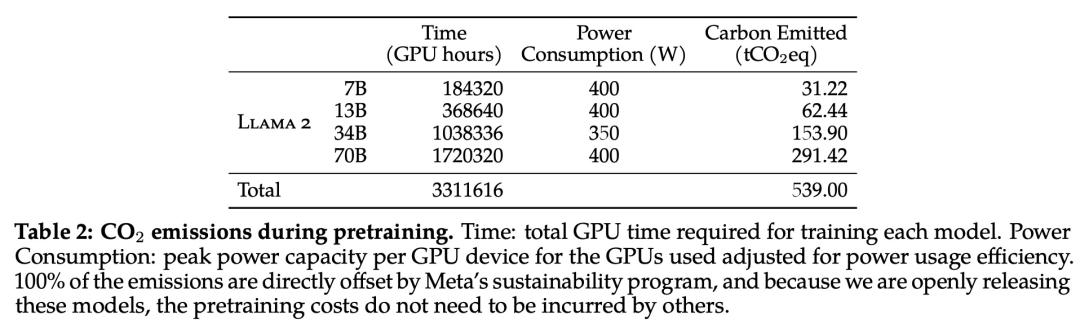 在预训练的碳足迹方面,Meta 根据以往的研究方法,利用 GPU 设备的功耗估算和碳效率,计算了 Llama 2 模型预训练所产生的碳排放量。