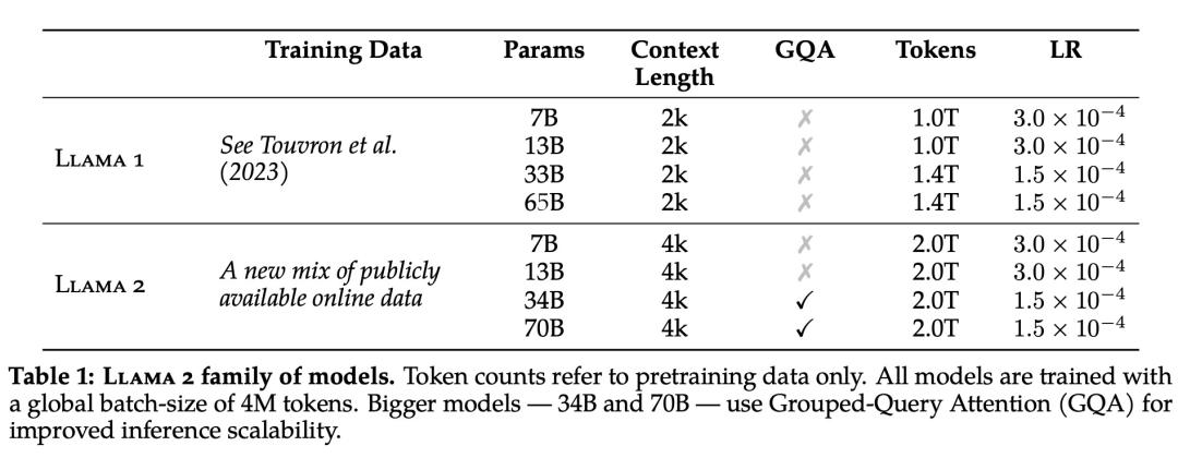 具体而言,Meta 执行了更稳健的数据清理,更新了混合数据,训练 token 总数增加了 40%,上下文长度翻倍。下表 1 比较了 Llama 2 与 Llama 1 的详细数据。