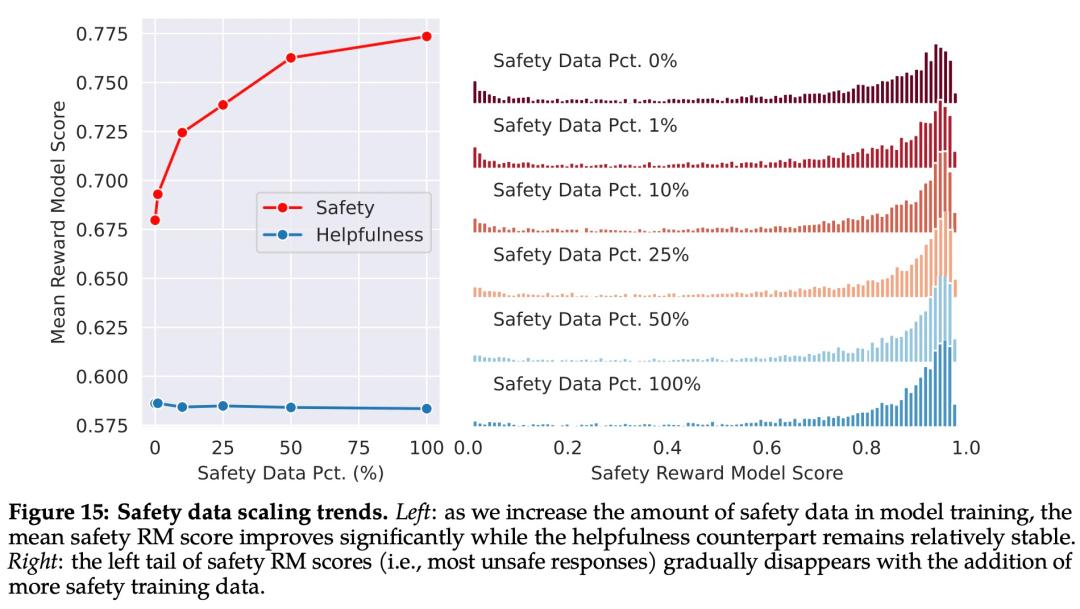 如下图 15 所示,Meta 使用平均奖励模型得分作为模型在安全性和有用性方面的表现结果。Meta 观察到,当他们增加安全数据的比例时,模型处理风险和对抗性 prompt 的性能显著提高。