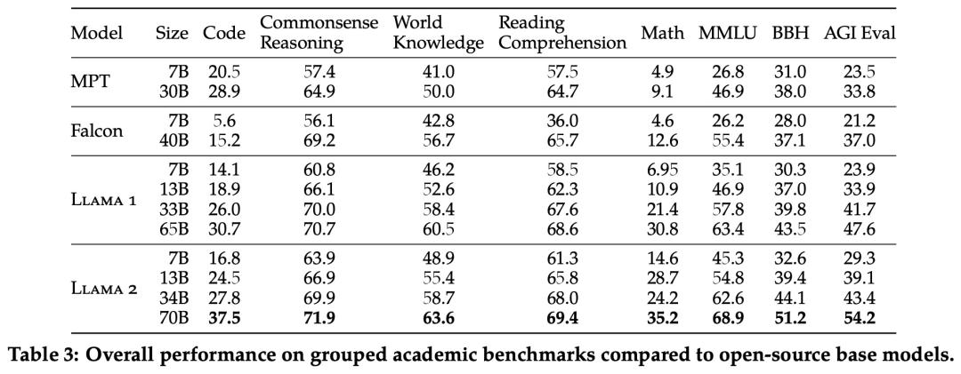 下表 3 总结了这些模型在一系列流行基准上的整体性能,结果表明,Llama 2 优于 Llama 1 。