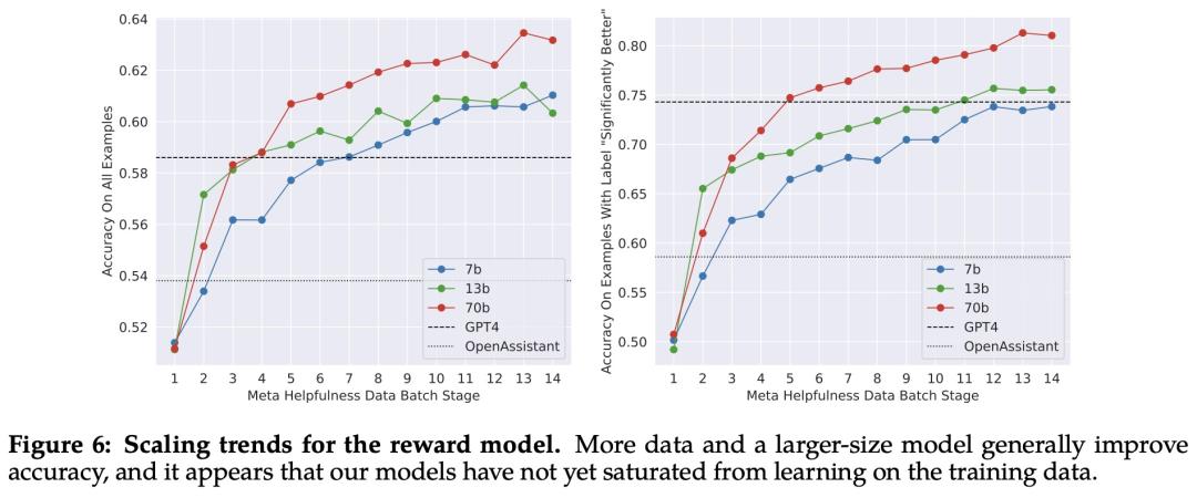 缩放趋势。Meta 研究了奖励模型在数据和模型大小方面的缩放趋势,在每周收集的奖励模型数据量不断增加的情况下,对不同的模型大小进行了微调。下图 6 报告了这些趋势,显示了预期的结果,即在类似的数据量下,更大的模型能获得更高的性能。