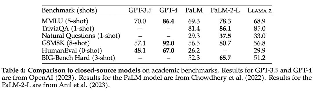 除了开源模型之外,Meta 还将 Llama 2 70B 的结果与闭源模型进行了比较,结果如下表 4 所示。Llama 2 70B 在 MMLU 和 GSM8K 上接近 GPT-3.5,但在编码基准上存在显著差距。