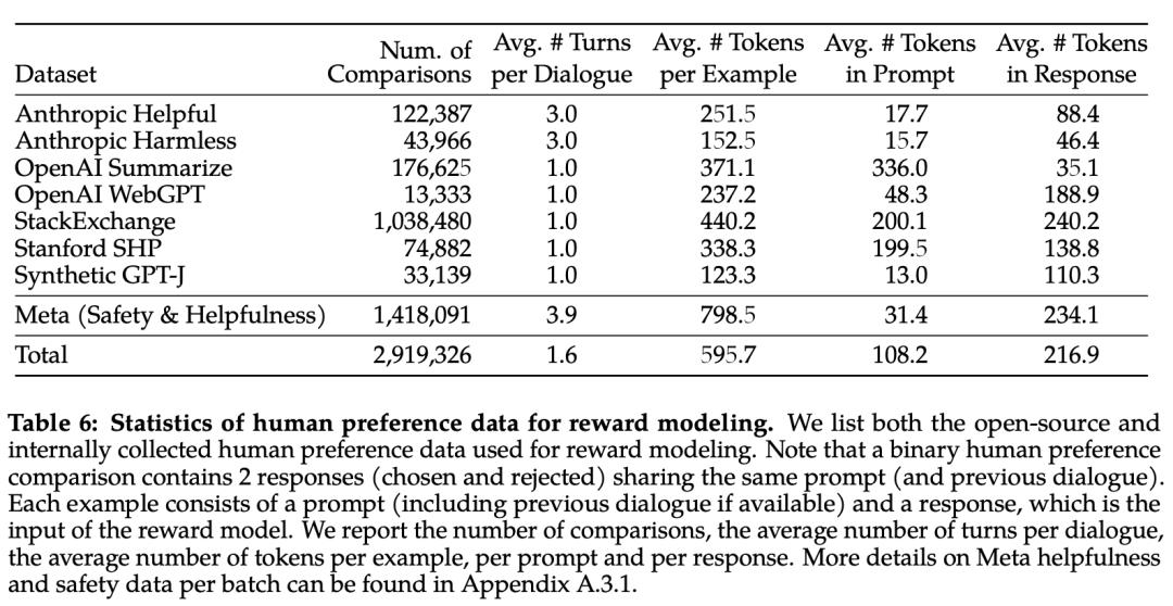 下表 6 报告了 Meta 长期以来收集到的奖励建模数据的统计结果,并将其与多个开源偏好数据集进行了对比。他们收集了超过 100 万个基于人类应用指定准则的二元比较的大型数据集,也就是元奖赏建模数据。