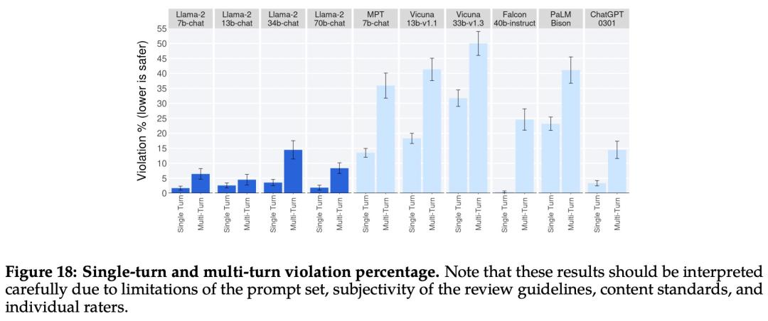 下图 18 展示了单轮和多轮对话的违规百分比。跨模型的一个趋势是,多轮对话更容易引发不安全的响应。也就是说,与基线相比,Llama 2-Chat 仍然表现良好,尤其是在多轮对话中。