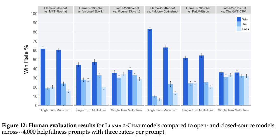 再来看人类评估结果。如下图 12 所示,Llama 2-Chat 模型在单轮和多轮提示方面均显著优于开源模型。特别地,Llama 2-Chat 7B 在 60% 的提示上优于 MPT-7B-chat,Llama 2-Chat 34B 相对于同等大小的 Vicuna-33B 和 Falcon 40B,表现出了 75% 以上的整体胜率。