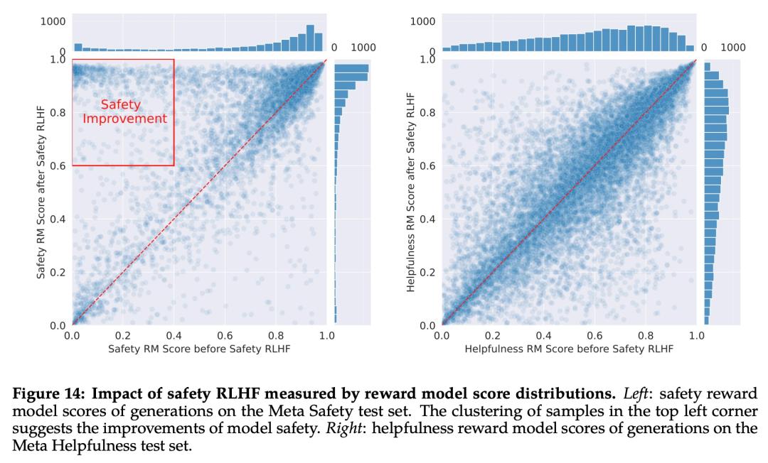 Meta 首先通过收集人类对安全性的偏好数据来进行 RLHF,其中注释者编写他们认为会引发不安全行为的 prompt,然后将多个模型响应与 prompt 进行比较,并根据一系列指南选择最安全的响应。接着使用人类偏好数据来训练安全奖励模型,并在 RLHF 阶段重用对抗性 prompt 以从模型中进行采样。