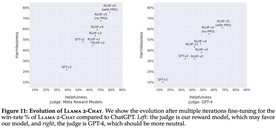 随着收到更多批次的人类偏好数据注释,能够训练出更好的奖励模型并收集更多的提示。因此,Meta 训练了连续版本的 RLHF 模型,在此称为 RLHF-V1、...... , RLHF-V5。