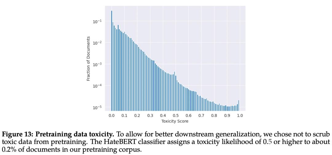 该研究使用在 ToxiGen 数据集上微调的 HateBERT 分类器来测量预训练语料库英文数据的「毒性」,具体结果如下图 13 所示: