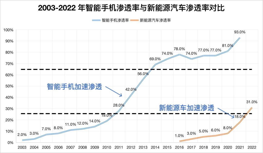 如果参考手机市场的替代路径,就会发现新能源渗透趋势与智能手机的渗透路径十分相似。