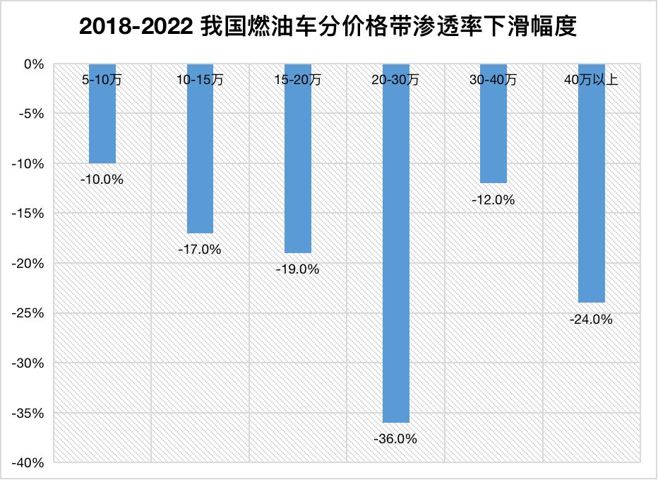 自主品牌的不断进攻换来的是燃油车渗透率的持续下滑,尤以20-30万价格带严重。