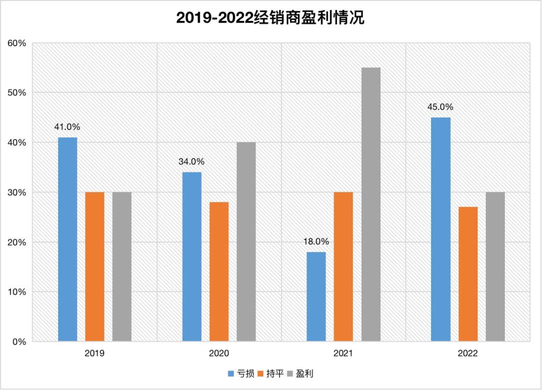 根据中国汽车流通协会发布的《2022年全国汽车经销商生存状况调查报告》(调查对象以乘用车授权经销商为主),2022年仅有29.7%的经销商实现盈利,较上年进一步缩窄。品牌经销商的退网率同样居高不下,2022年北京现代、别克、东风标致、斯柯达等合资品牌的合计退网率高达57%。
