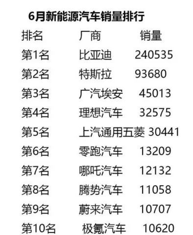 和讯网统计的数据显示,6月霸主比亚迪售出24万辆,9.37万辆的亚军特斯拉与其就差了一个身位,再到下一个分界线,第五名上汽通用五菱尚有3万+销量,第六名零跑就断崖下跌至1.3万,随后的哪吒、腾势、蔚来则分别以1.2万辆、1.1万辆及1.07万辆的微弱差距紧跟。