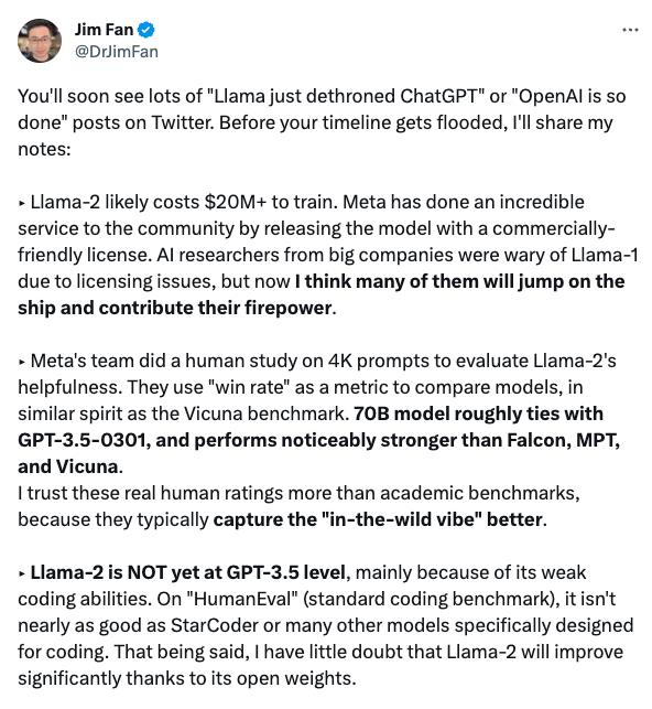 论及 Llama 2 此次真正的优势,Nvidia 高级 AI 科学家 Jim Fan 高度评价道: