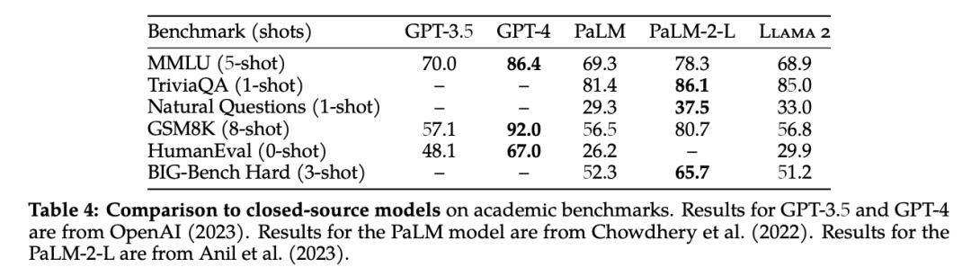 和闭源的大模型相比,Llama 2 70B 在推理任务上接近 GPT-3.5,但在编码基准上存在显著差距。同时,其在性能上还无法与 OpenAI 的 GPT-4、PaLM-2-L 相媲美,在计算机编程方面 Llama 2 明显落后于 GPT-4。
