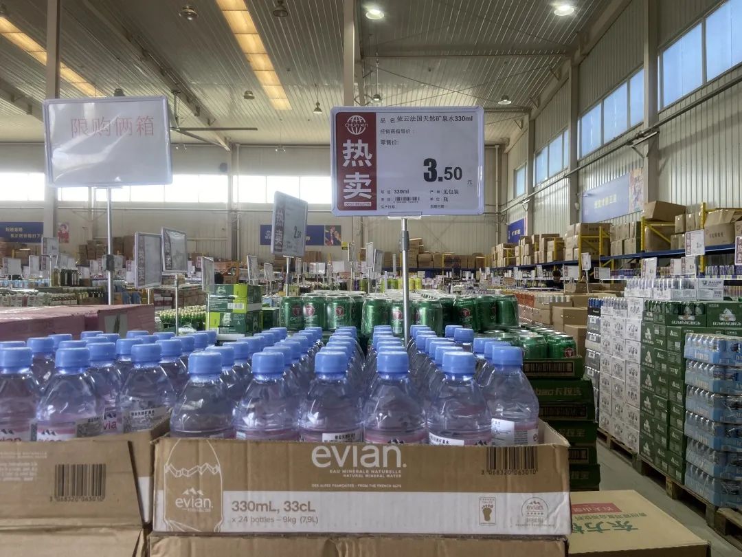 3.5元的依云矿泉水、1.9元的德国黑啤、3.3元的元气森林......大量低于超市、便利店售价的头部品牌产品聚集于上千平方米的大型仓储门店内,每一个消费者都将大份额包装的特价产品一一填满购物车中。这样的价格和消费景象出现在淳欣全球优品折扣仓内,该店位于西安市高新区贝多物流产业园,园区入口处即可看到位于右方的折扣仓门店。