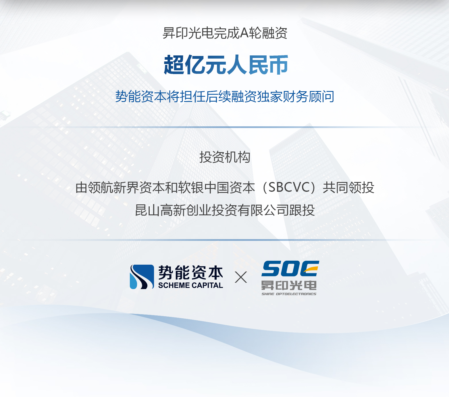 近期,掌握全球领先的平台型微纳米技术的高科技公司昇印光电完成超亿元人民币A轮融资。本轮融资由领航新界资本和软银中国资本(SBCVC)共同领投,昆山高新创业投资有限公司跟投。势能资本将担任昇印光电后续融资独家财务顾问。