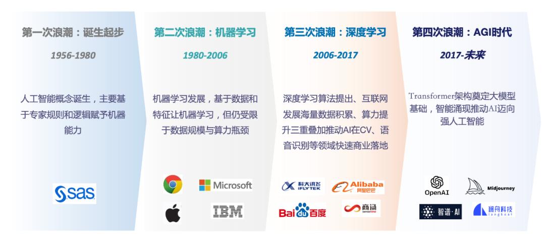 2022年被公众认为是“生成式AI元年”,生成式AI被Gartner列为2022年顶级战略技术之一,并入选中国信通院发布的“2022人工智能十大关键词”。 在过去,AI经历了四次重大浪潮,当前生成式AI开辟了人工智能新纪元,AI加速向通用人工智能AGI方向演进。 据Gartner预测,到2025年生成式AI产生的数据将占到所有数据的10%,而2021年生成式AI产生的数据不到所有数据的1%。