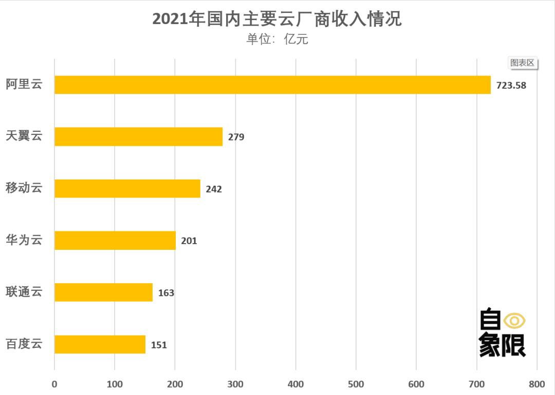 - 2021年,各云厂商营收:阿里云723.58亿元、电信云279亿元、移动云242亿元,华为云201亿元、百度云151亿元、联通云163亿元。