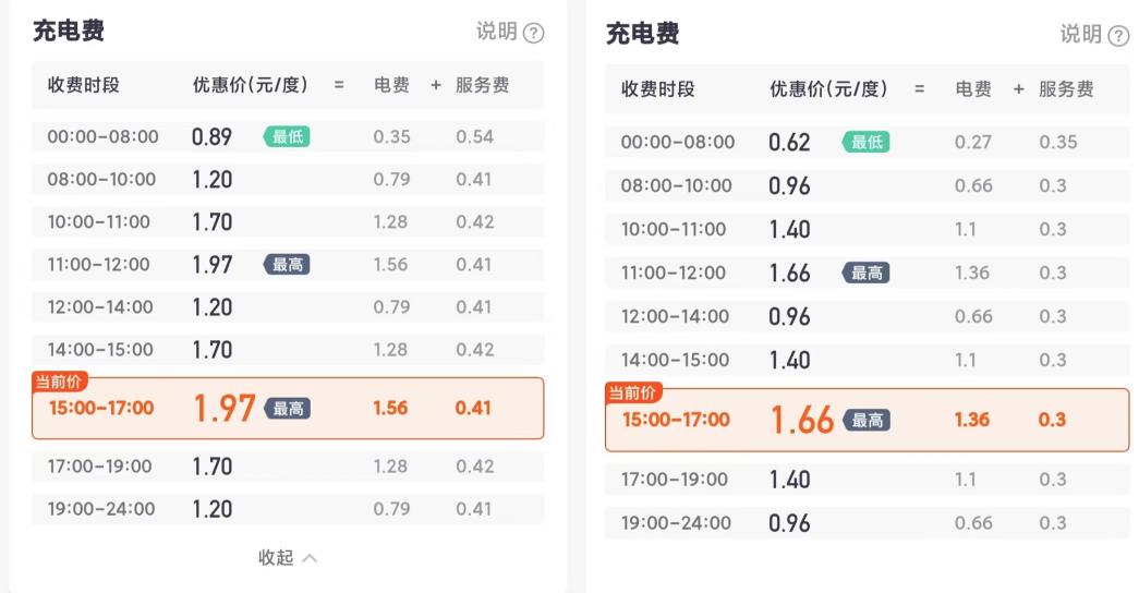 小通对比了同一充电品牌在不同地区的服务价格,可以基本得出以下结论:针对不同地区,一线城市的服务费比其他地区高不少;没有专人看管,仅提供充电的充电桩,其服务费会比设置在停车场的充电桩更低;在时间方面,用电高峰时段的电价明显高出不少,但服务费会稍微便宜一丢丢。