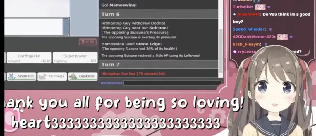 Neuro-sama 算是被认可的情绪丰富的 AITuber,但是整体语调依然很平,情绪的表达更多时候通过预设表情和在句末 Heart 或者 Wink 来打辅助。下面的画面是 Neuro 出 bug 时说 heart 时的搞笑场面。而最近很火的 AI 视频聊天 App Call Annie,无论受到质疑、还是道歉,也是一个语调应对所有场景。