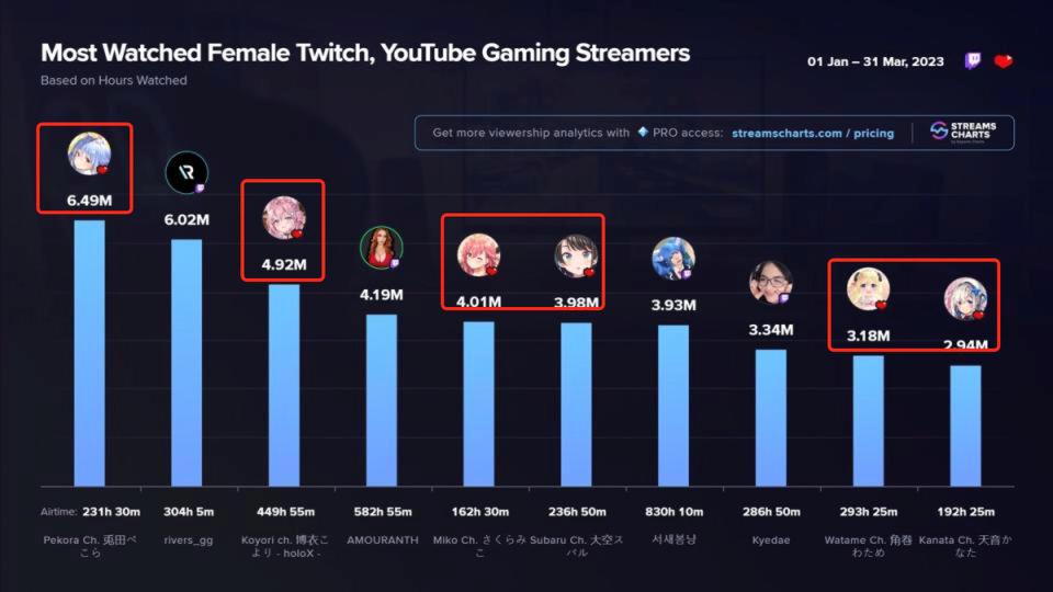 女主播在 Twitch 和 YouTube 的观看时长排名(2023 年一季度) | 图片来源:Stream Charts