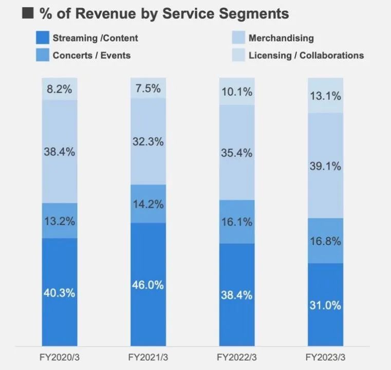 从收入结构来看,Hololive 的收入主要分 4 块,直播及内容收入,活动收入,产品销售收入,授权及合作收入。其中,在 2023 财年直播收入仅占 31%,而且根据历年数据这个占比有下降的趋势。而活动、产品销售、授权合作等与 IP 有关的收入占据了更大的比例,主要增长点也在 IP 价值。
