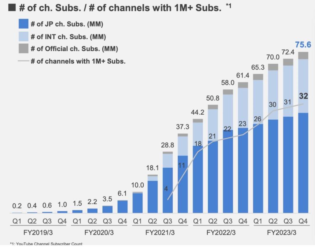 在对 2024 财年的展望中营业额和净利润的预期增幅仅有 30%,远远低于本财年增幅,说明公司对于收入的持续高增长缺乏信心,其主要原因是日本 VTuber 市场的饱和。这种情况,从财报中的 YouTube 订阅人数增长也可以窥见一二,日本频道在这一年只有少量的增长,而国际频道订阅数增长则占了绝大部分,日本市场的增长缓慢,可能是 Hololive 调低增长预期的原因。