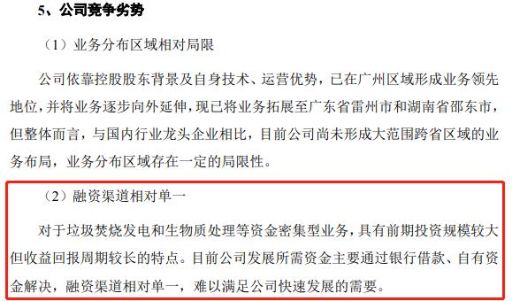 同时,关于竞争劣势,永兴股份列举了融资渠道相对单一,即对于垃圾焚烧发电和生物质处理等资金密集型业务,具有前期投资规模较大但收益回报周期较长的特点。目前公司发展所需资金主要通过银行借款、自有资金解决,融资渠道相对单一,难以满足公司快速发展的需要。