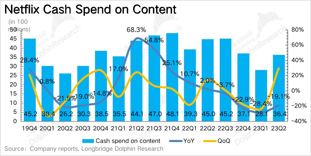 上两个季度财报点评中,海豚君都提到奈飞新一轮的内容投资周期临近。从内容支出同比增速来看,二季度已经开始出现了拐点。