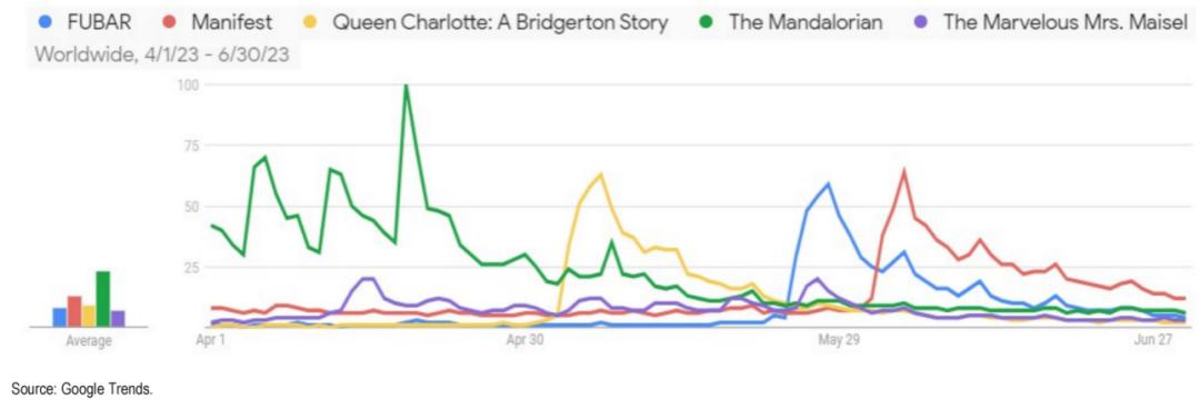 内容上播出的优质影片也不少,也对用户增长有一定作用,比如《The Mandalorian》、《Queen Charlotte》,6月底《The Withcher》第三季开始播出,延续了前两季的热度,在目前时段的奈飞平台上收视最高。