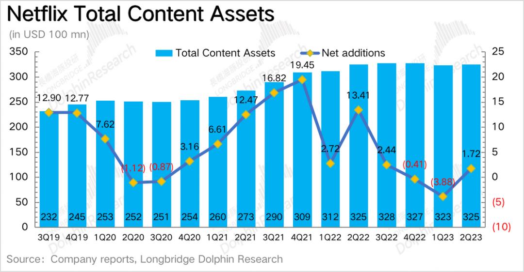 海豚君在过去几个季度的财报点评中反复提及,奈飞的内容摊销一直在增加,但内容投资的在加速下滑。当内容资产规模在上季度开始环比转负后,就说明奈飞的内容投资可能要触底反弹。