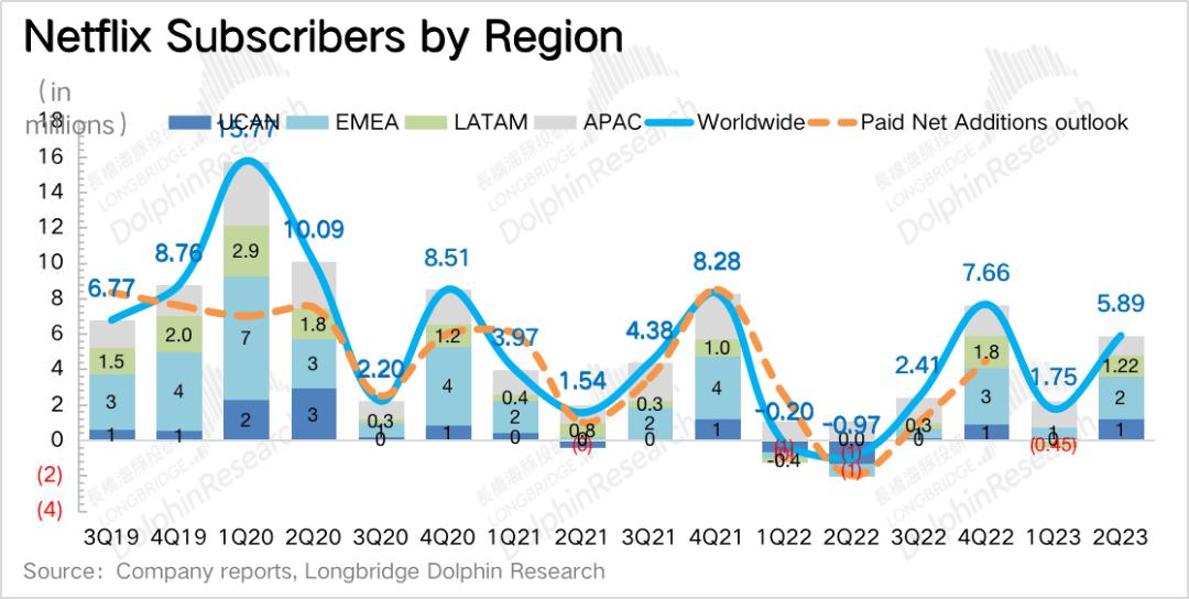 二季度订阅用户净增加589万,明显超出市场已经在近期提高过之后的预期200万。用户增加主要源于5月份在全球100多个国家推出打击账户共享的经营战略,管理层宣称下半年还将继续在剩余的国家地区推进这个策略。
