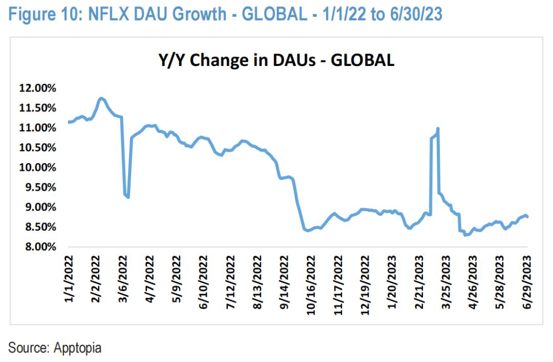还是从Nielsen的数据来看,Netflix在4月内容较以往平淡的情况下,在流媒体中的收视份额跌至6.9%。而在5月账户共享限制之后,平台的收视份额一下子跳到了7.9%,6月继续提升至8.2%。